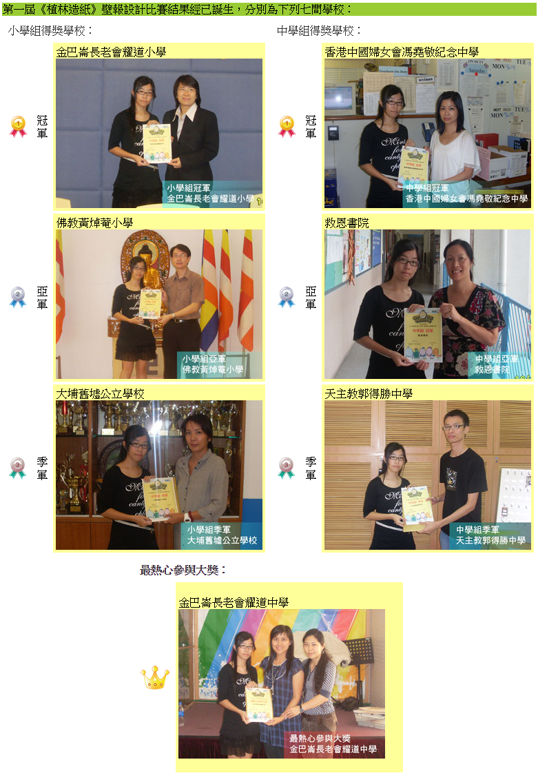 參賽作品經由香港美術教育協會代表作細心的評選後,已經得出以下結果。本會已正在舉辦第二屆《植林造紙》壁報設計比賽,如老師或同學尚未加與,可於http://www.ert.org.hk/plantation2 了解詳情或下載報名表格交予視藝科負責老師,再次感謝你們的支持。